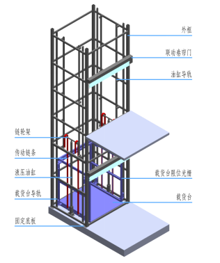 导轨式升降平台是通过液压油缸驱动链轮架,液压油压力传动的牵引力,曳引链条两端分别连着载货台和主机架,上升时,液压站输出高压推动油缸上行,带动平台举升;下降时,液压站电机停止工作,控制阀打开油回路,平台在自重作用下缓慢下降,无需电机驱动,节能环保。